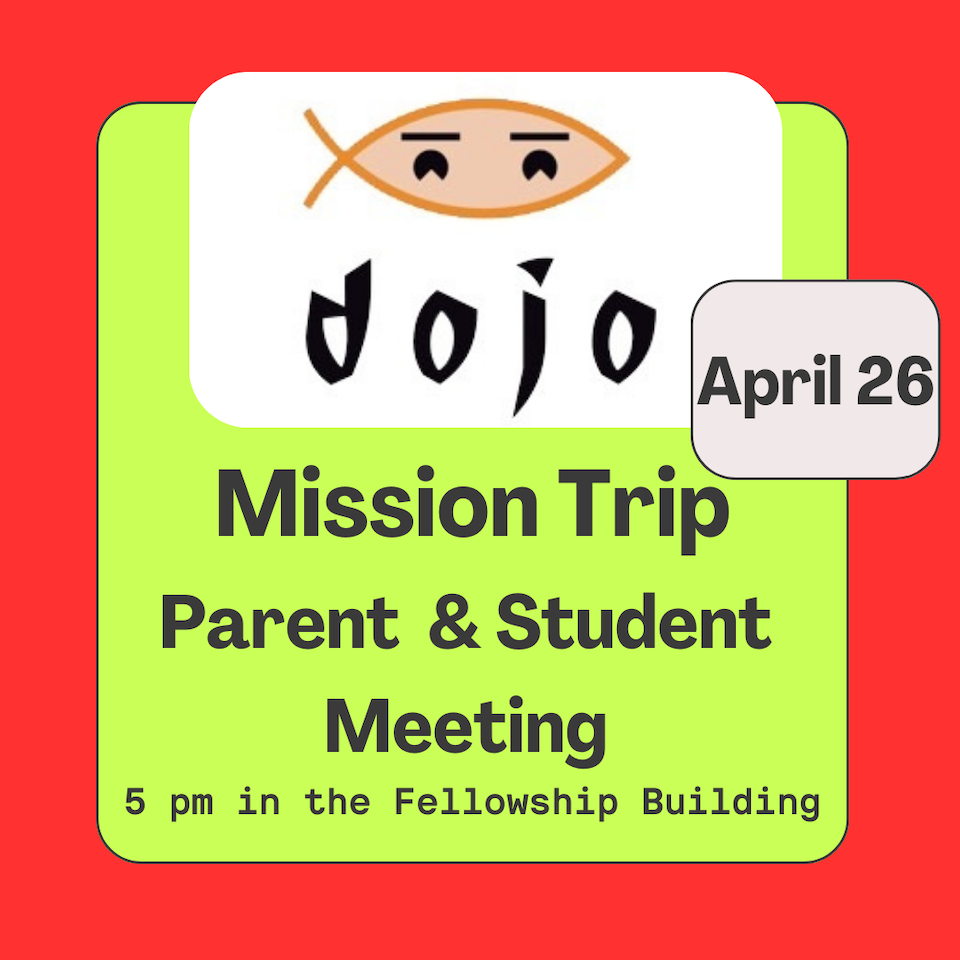 Mission Trip Pre-Trip Parent and Student MeetingWe’re getting close to departure, and it’s time for our Parent & Student Pre-Trip Meeting.This important meeting is for all students attending the mission trip and at least one parent/guardian. We’ll be covering final travel details, expectations, and everything you need to know before we leave.At this meeting, students will receive:Luggage tagsMission trip t-shirtsFinal travel itinerary and trip detailsImportant reminders and packing informationWe’ll also review schedules, communication plans, emergency contacts and answer any last-minute questions.Date: Sunday, April 26th Time: 5 PMLocation: Fellowship BuildingPlease make every effort to attend — this meeting is essential to ensure everyone is fully prepared and confident for the trip.We can’t wait to see what God will do through this experience!